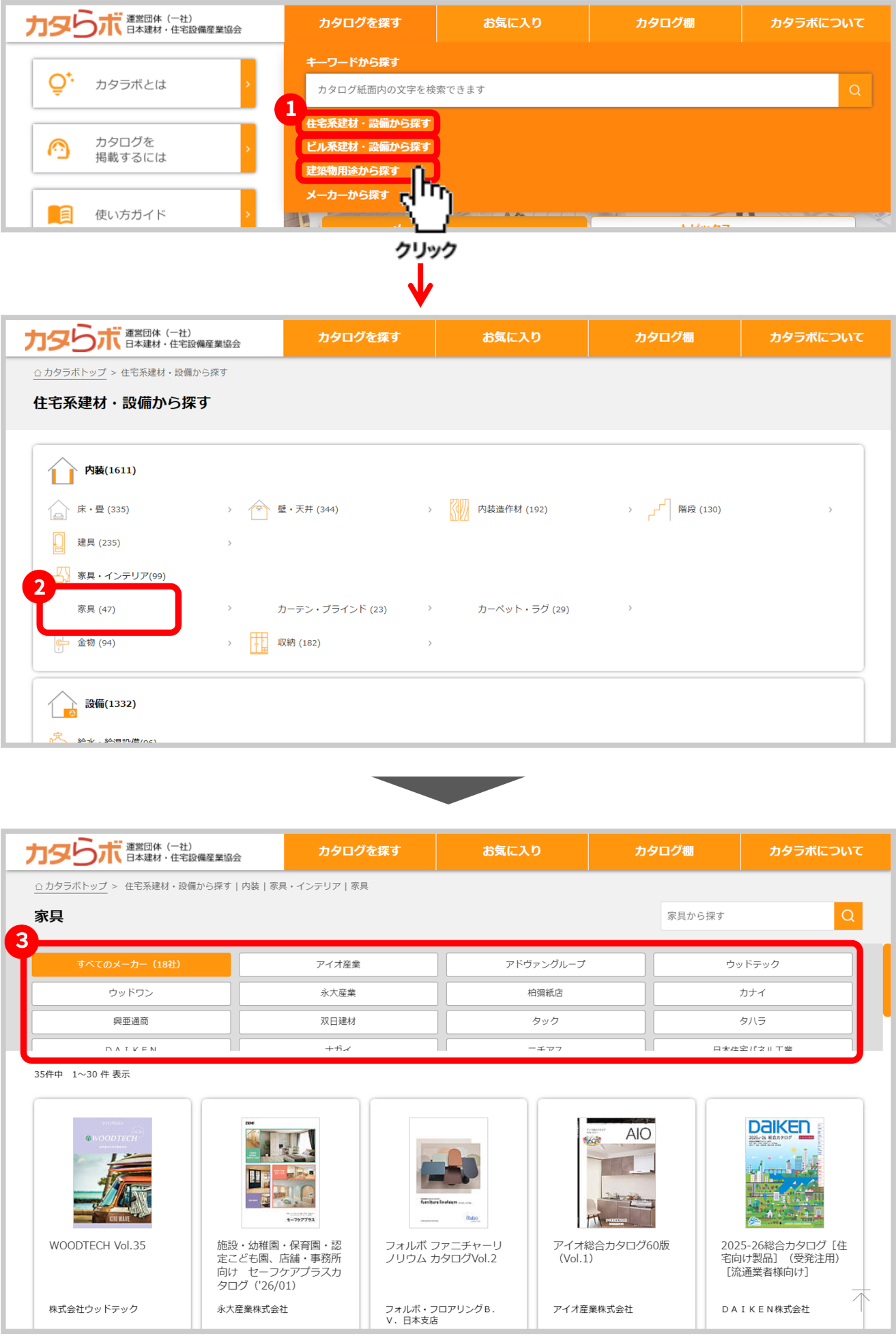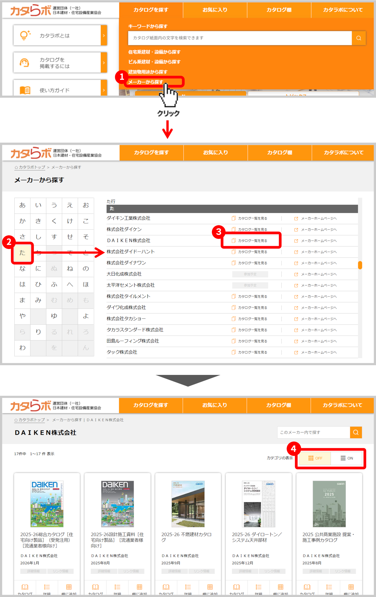 メーカーのカタログをカテゴリごとの一覧に表示切り替えすることができます。