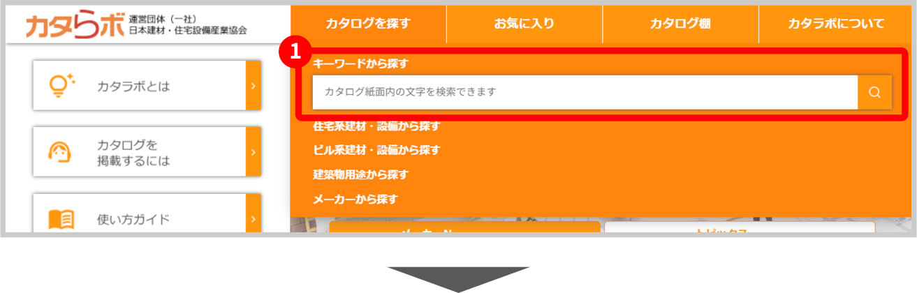 ページ上部の「カタログを探す」内の検索フォームに、探したいキーワードを入力して「検索」ボタンをクリックするとキーワードに関連するカタログが表示されます。